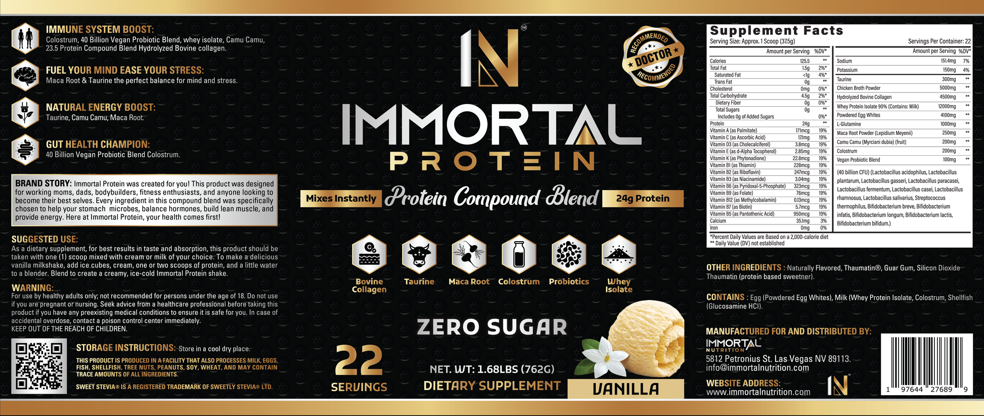 The Immortal Protein compound blend gives your body whey isolate, pea protein, beef, chicken, egg whites, collagen, 40 billion probiotics, camu camu, ashwagandha, glutamine, glucosamine, colostrum, organic matcha green tea, yams, sweet potato, multivitamin, and maca root. There is no other protein powder out there like this one.